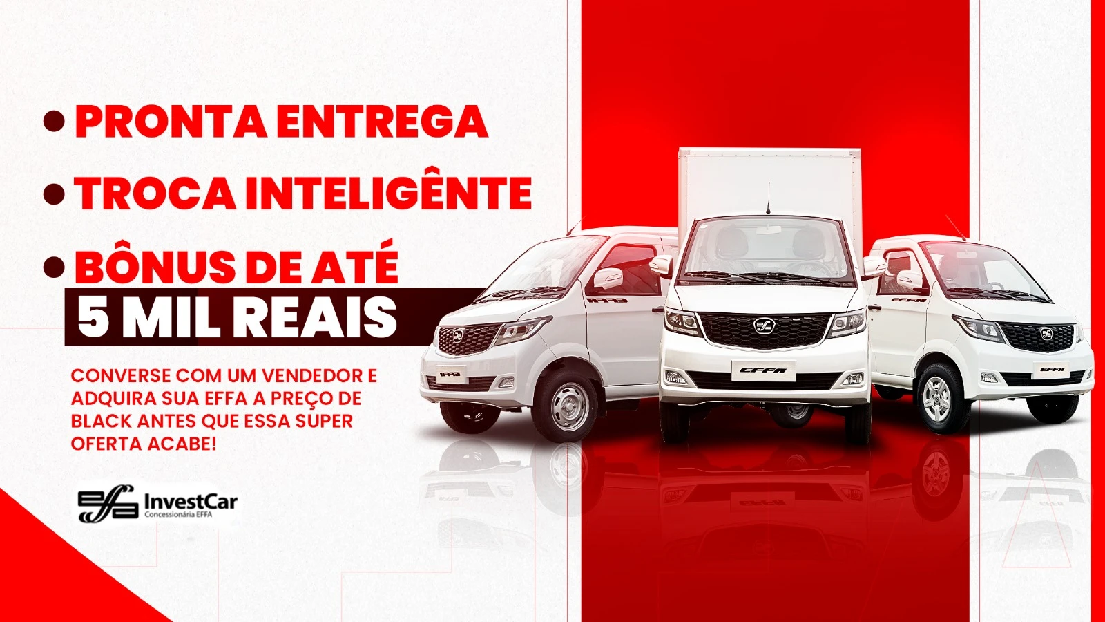A melhor opção para comprar as picapes e furgão EFFA é a InvestCar BH. Temos as melhores condições.